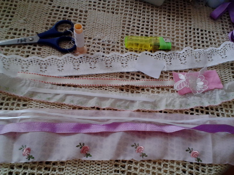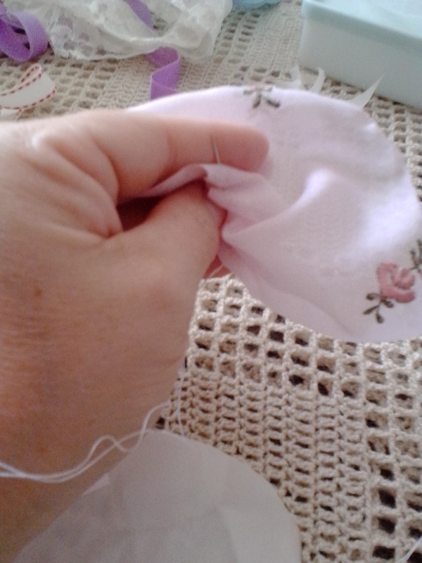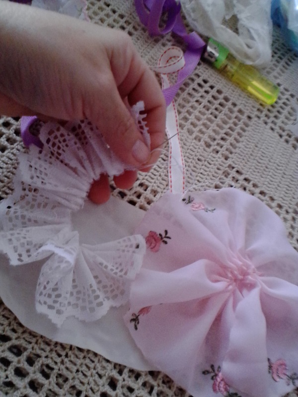 Luego tomé la cinta rosada con flores bordadas de un metro aproximadamente con la cual previamente ya la había cortado y quemado sus orillas y procedí con hilo y aguja a coser tipo hilván por un extremo de la misma para convertirla en una roseta grande y así también con el encaje blanco.