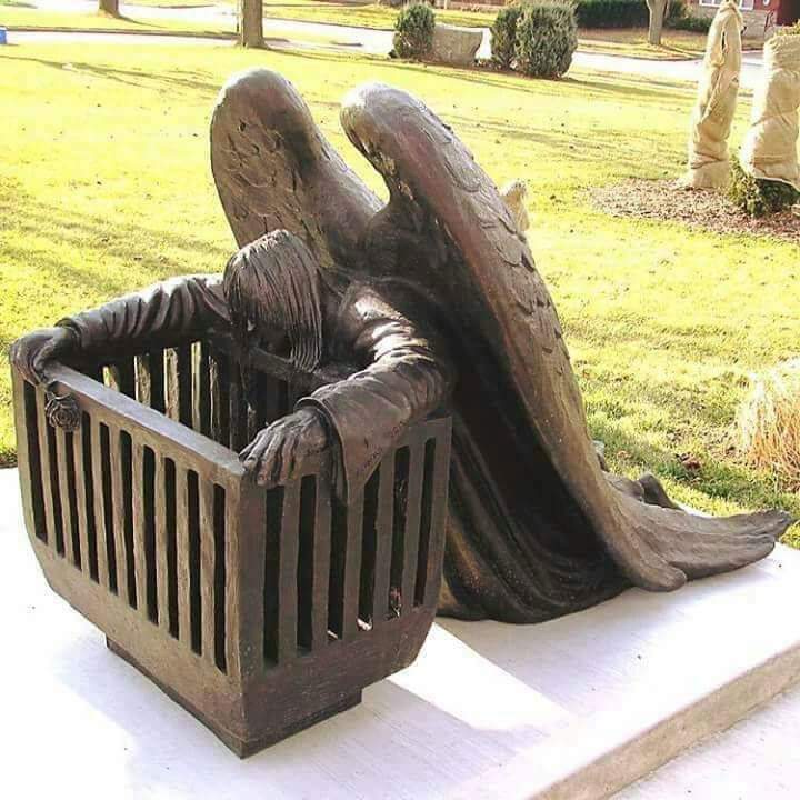 El Ángel de la guarda llorando frente a una cuna vacía, monumento en un cementerio de Canadá por los niños abortados.