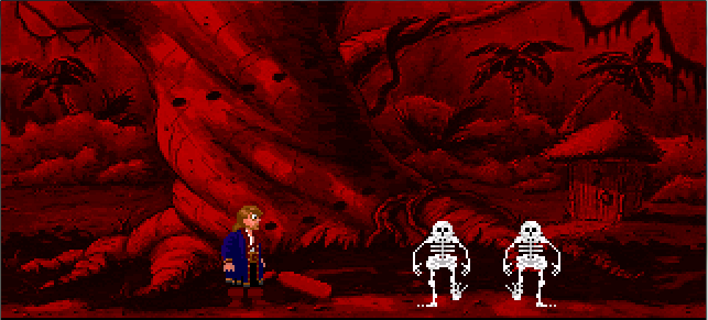 Sin mencionar que contiene muchas escenas extrañas, posiblemente colocadas por humor únicamente, como la que ven en la anterior imagen, Guybrush se golpeó la cabeza y tuvo una alucinación sobre sus padres muertos, tomaron forma esquelética y se pusieron a bailar mencionando un ritmo peculiar, pareciera una simple escena de broma, pero termina siendo este una pista impotante más adelante, me hace pensar si las otras escenas tendrán algo que ver para revelar el misterio de Monkey Island.