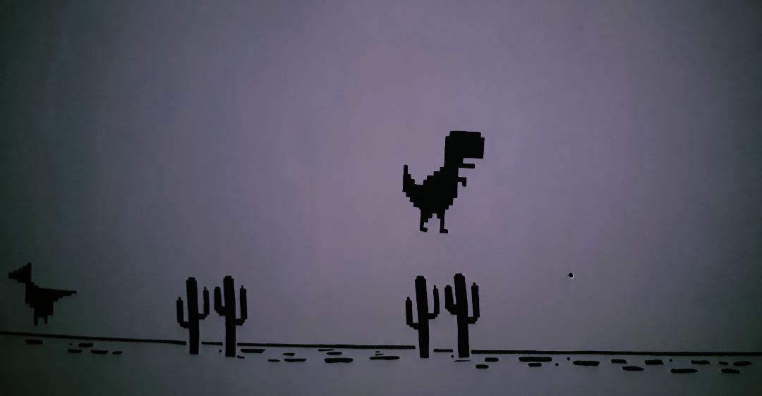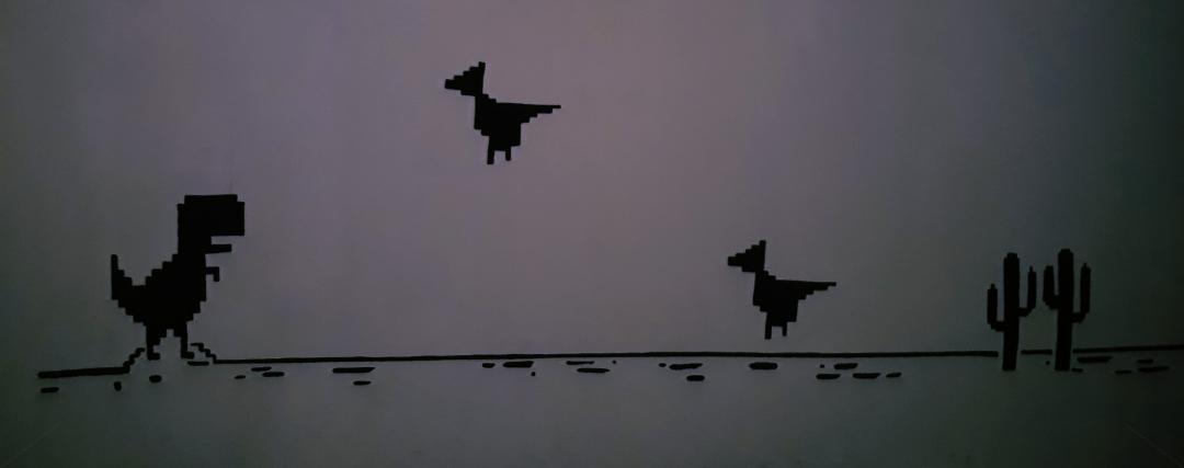 Teniendo todo este tiempo libre un día decidí modificar mi cuarto, haciendo un boceto de lo que quería ver en mi habitación. Cuando se me ocurrió la brillante idea de ir a Internet de buscar modelos de cuartos olvidando lo del problema del Internet, abrí el buscador y lo único que encontré fue el dinosaurio del juego dándome una idea para plasmarla en una pared.