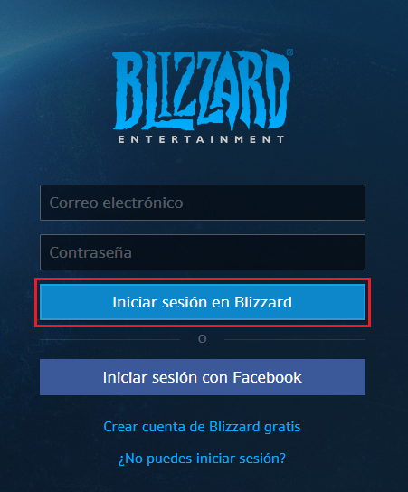 Una vez introducidos los datos de usuario (correo electrónico), la contraseña de nuestra cuenta y clicaremos sobre el botón azul de “Iniciar sesión en Blizzard”; Si nos registramos con la cuenta de FaceBook, tendremos que acceder con los datos de la cuenta de FaceBook.
