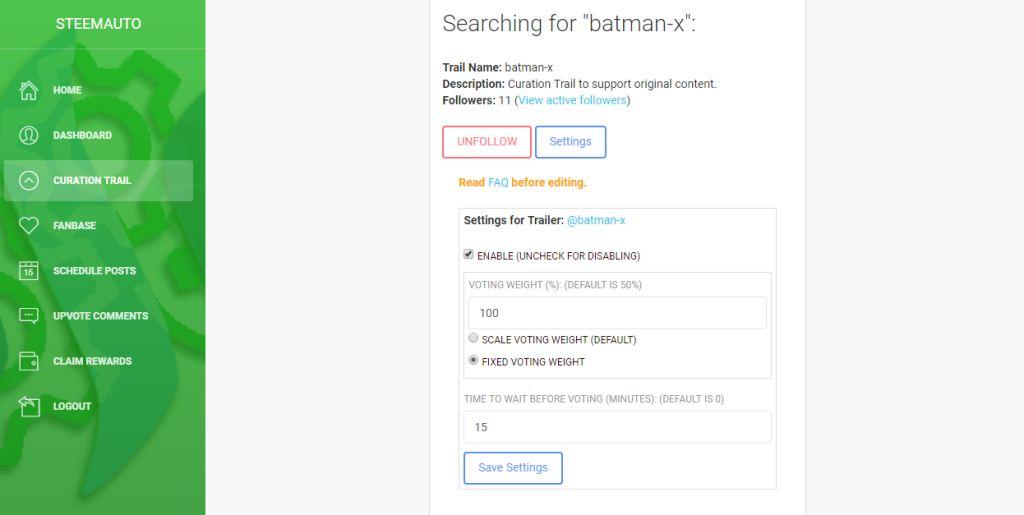 @batman-x para votar. Por defecto aparece 50% Pero debes colocarlo en 100% para ir en concordancia con tus compañeros del trail. En cuanto al tiempo, lo ideal sería 15 min. para mejorar la ganancia. Pulsas “Save settings” y listo! Felicidades, ya te has unido. Al unirte serás seguido por el trail y tus post recibirán upvotes de todos los miembros.