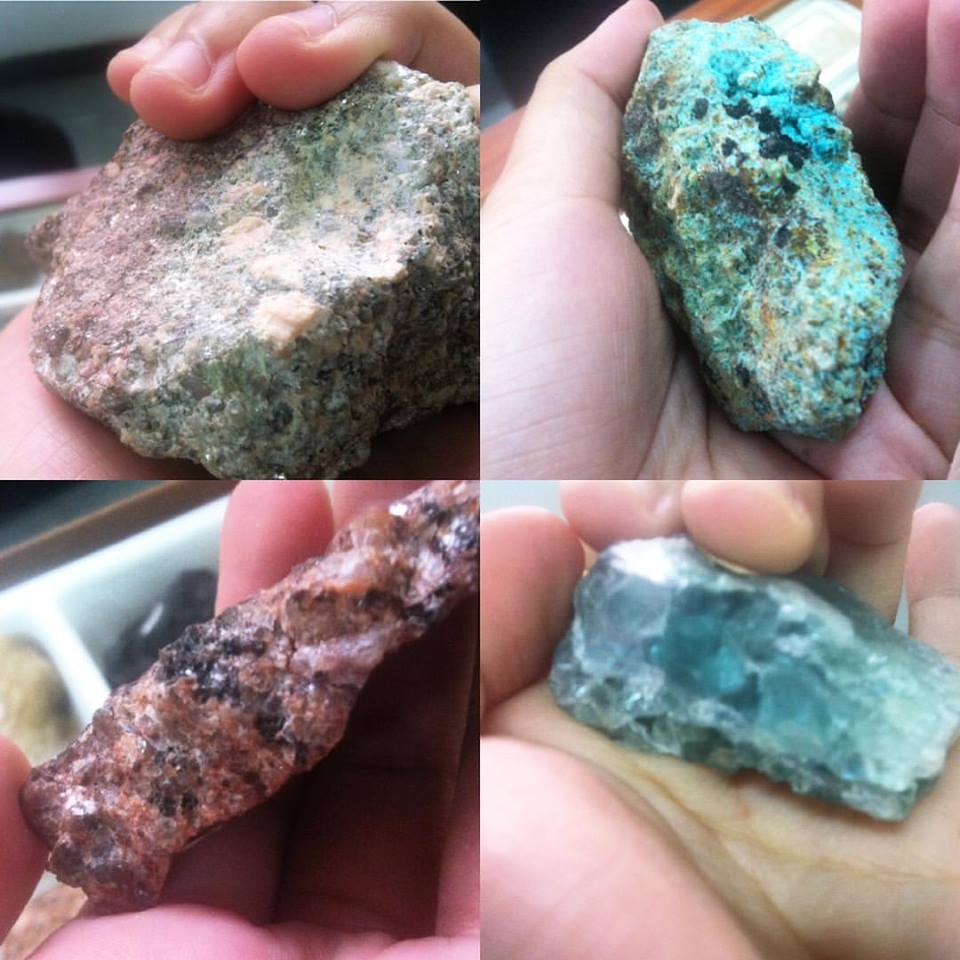 [de izq a der y de arriba hacia abajo] arcosa, malaquita, granito, fluorita