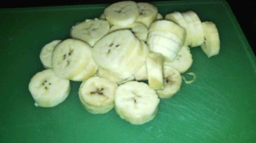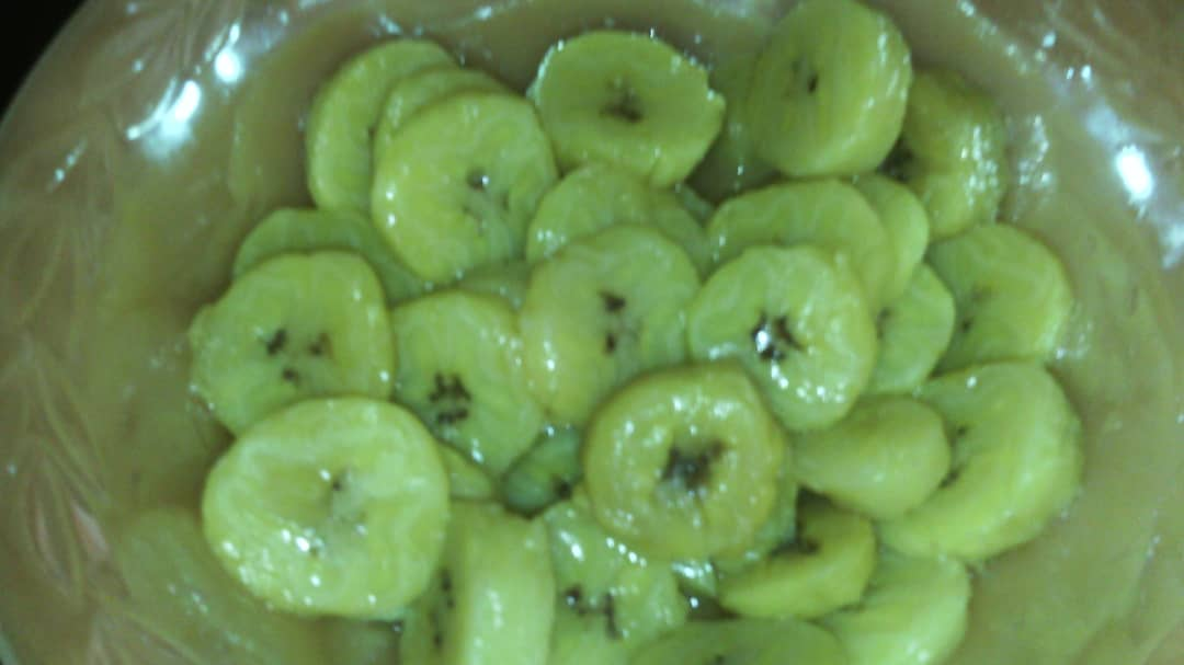 - Pelar y cortar los plátanos en ruedas delgadas, sancochar por unos minutos, escurrir y colocarlos en una taza con la copita de ron, revolver, dejarlos por unos 15 minutos para que se impregnen del sabor. (Reservar).