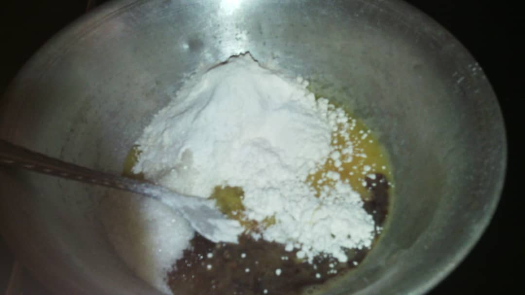 Batir el huevo, agregar harina, azúcar, vainilla y el polvo de hornear.