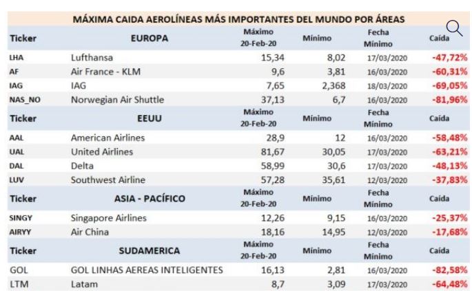 El sector de las aerolíneas se encuentra en quiebra técnica, es uno de los más perjudicados por el cierre de fronteras, no solo han caído sus acciones si no que les es imposible operar por la falta de clientes.