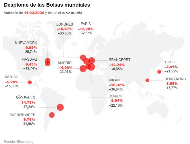 Wall Street viene de sufrir el desplome más rápido de su historia, los índices Dow Jones, S&P500 y Nasdaq han caido mas de 20% con respecto al mes de febrero. En Europa los índices ya pierden alrededor de un tercio de su valor, el desplome bursátil se produjo después de que la Organización Mundial de la Salud (OMS) anunciara que el coronavirus es oficialmente una “pandemia”, que pasó de ser una amenaza de oriente a una realidad con la que el mundo tendrá que convivir meses.