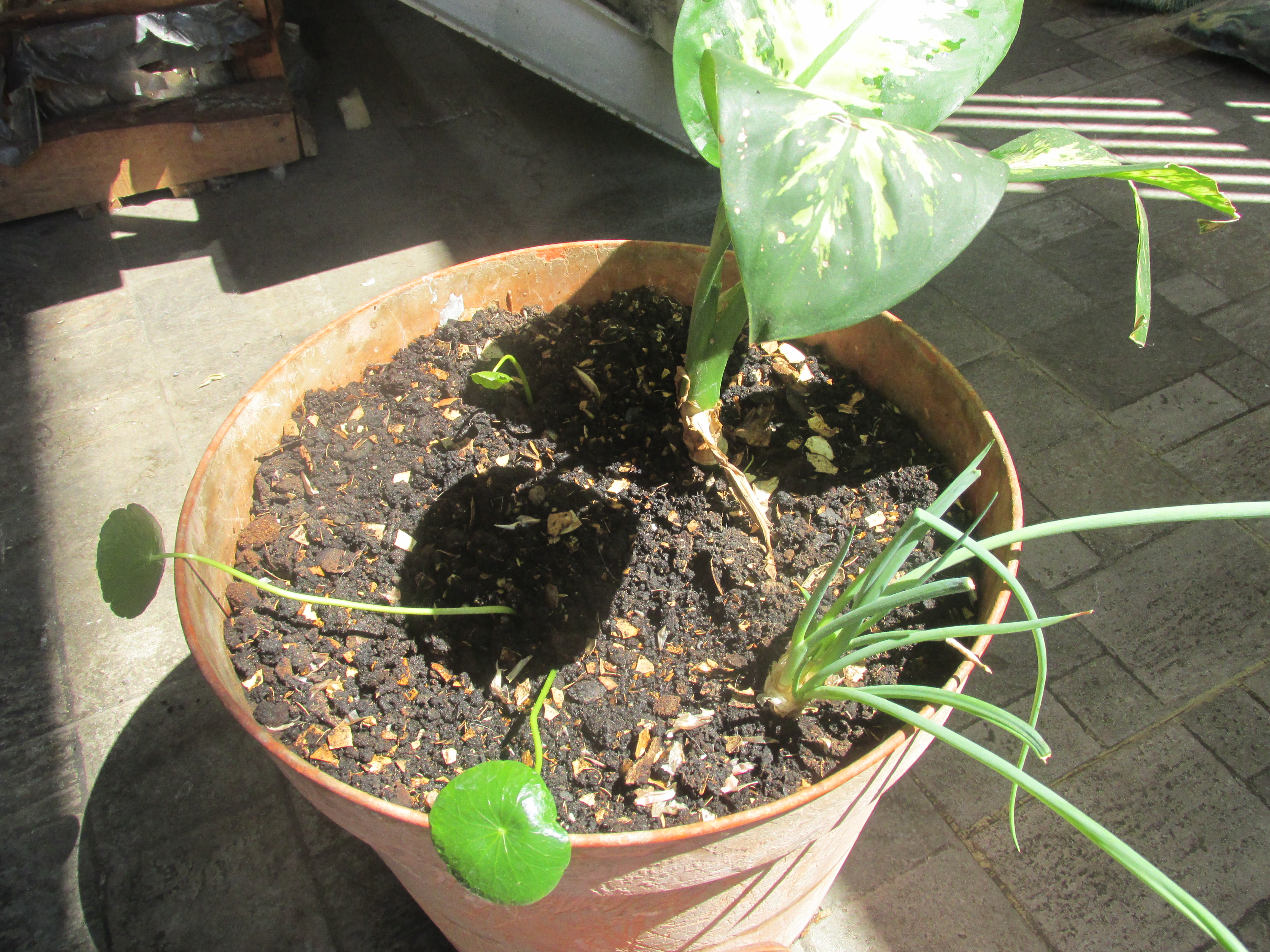 ¡Hola gente de steemit y amantes de la fotografía! espero se encuentren muy bien en este día, en esta ocasión les traigo unas fotos donde me inspiré en tomarle fotos a una de mis macetas donde tenía predestinado sembrar unas determinadas plantas pero como no se dieron decidí incluir algunas que regalaron y bueno es una mezcla curiosa de una raíz de cebollín, unas raíces pequeñas de Lochita (centella asiática) y una planta ornamental que no recuerdo bien el nombre, les dejaré las fotos y si saben el nombre me lo dicen por favor.