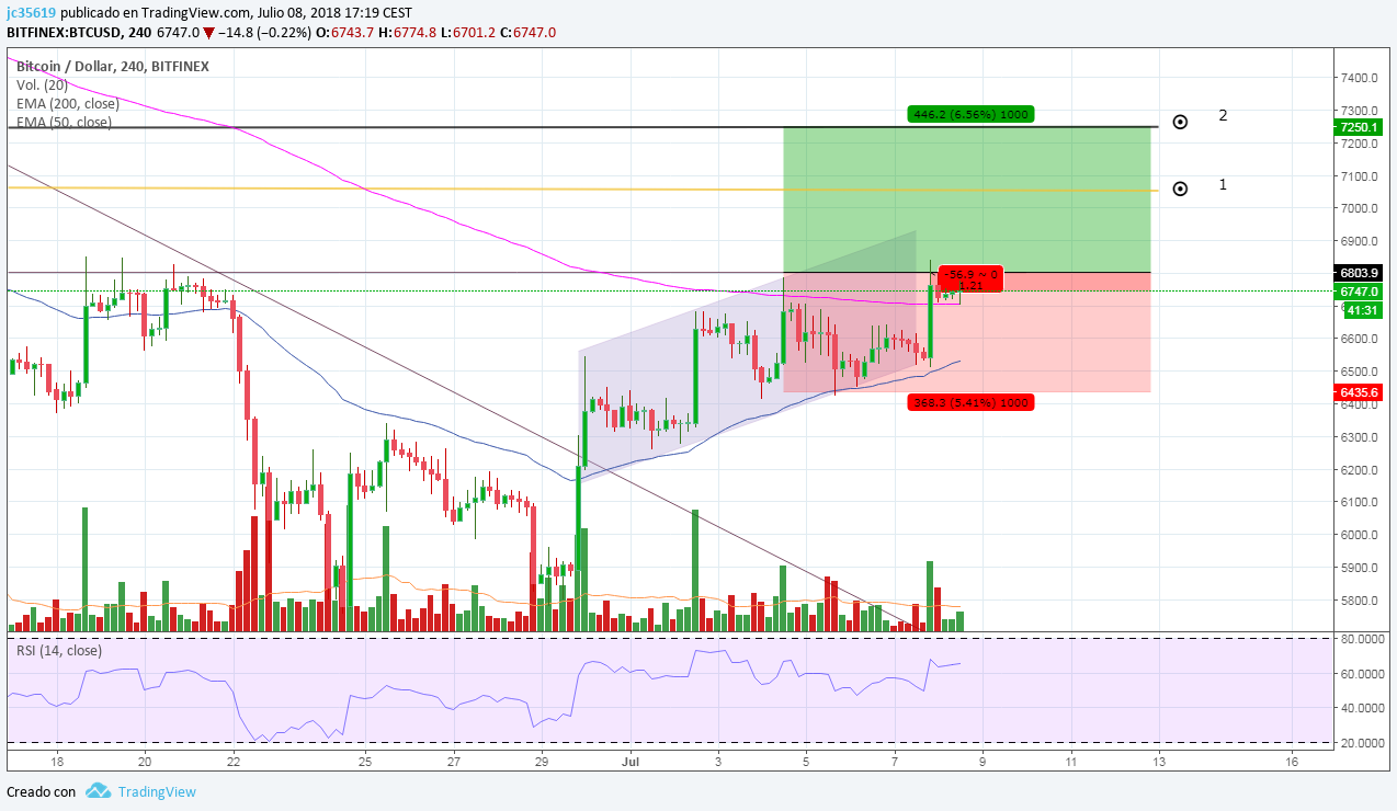 En el articulo publicado el día de ayer, comentamos que si bitcoin rompía el área de la zona de los $6800 con fuerza buscaríamos como objetivo los $7200 alrededor. Resulta que ocurrió un movimiento fuerte y bitcoin paso el área planteada pero en el mismo movimiento no tuvo la fuerza suficiente y bajo un poco hasta estabilizarse el los $6700. Ahora bien al momento de inversión lo mas recomendable es el rompimiento de los $6800, con fuerza y colocar nuestro stoploss en los $6500 donde se encuentra la media móvil de 50 periodo que actuaria como soporte. En la gráfica podemos ver: