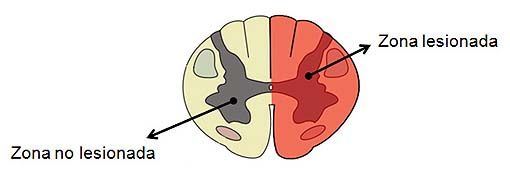 Se acompaña de una pérdida de la sensibilidad propioceptiva y vibratoria ipsilateral y por debajo del nivel de la lesión debido a afectación del cordón posterior así como una afectación de la sensibilidad termoalgésica contralateral por afectación del haz espino-talámico ipsilateral previo a su decusación (cruce) en cada nivel. Debido a que en el nivel de la lesión puede existir afectación del hasta anterior y posterior puede existir una paresia flácida ipsilateral y una zona de anestesia respectivamente en el nivel de la lesión, es diferente la falta de sensibilidad a la parestesia, ya que esta última es la sensación de pinchazos en las extremidades.