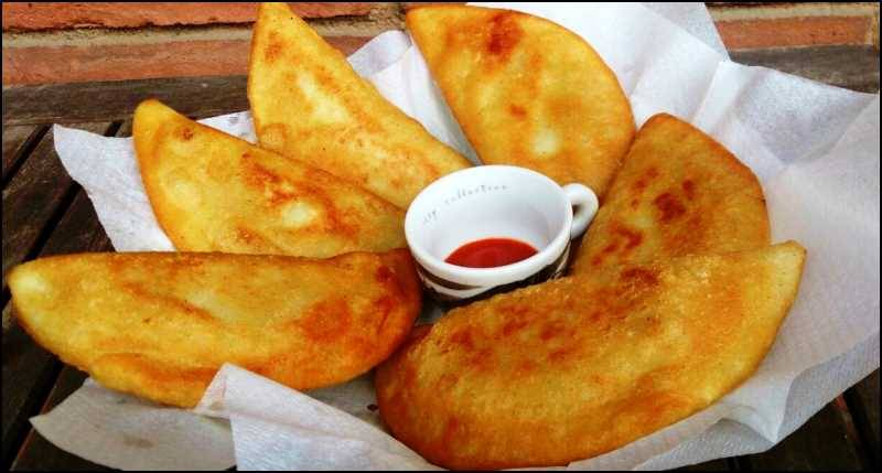Se prepara la masa, con 2 kilos de harina de maíz, 1 taza de harina de trigo, agua suficiente hasta que la masa quede húmeda y suave, ½ cucharada de sal, 1 cucharada de azúcar. Se unen todos los ingredientes, se amasa hasta que quede suave, se dividen en pedazos formando bolitas de unos 4 centímetros de diámetro, se estiran aplastando las bolitas sobre un plástico, en un mesón, se rellenan con el guiso, se voltean para cubrir el guiso colocando un lado sobre el otro, se dobla el plástico y se cierran los bordes dejando un semicírculo, se aprieta con los dedos y se corta el sobrante de la masa, se fríen en aceite caliente en un caldero. Cuando estén doraditas, se sacan del aceite y se colocan en posición vertical sobre papel absorbente.