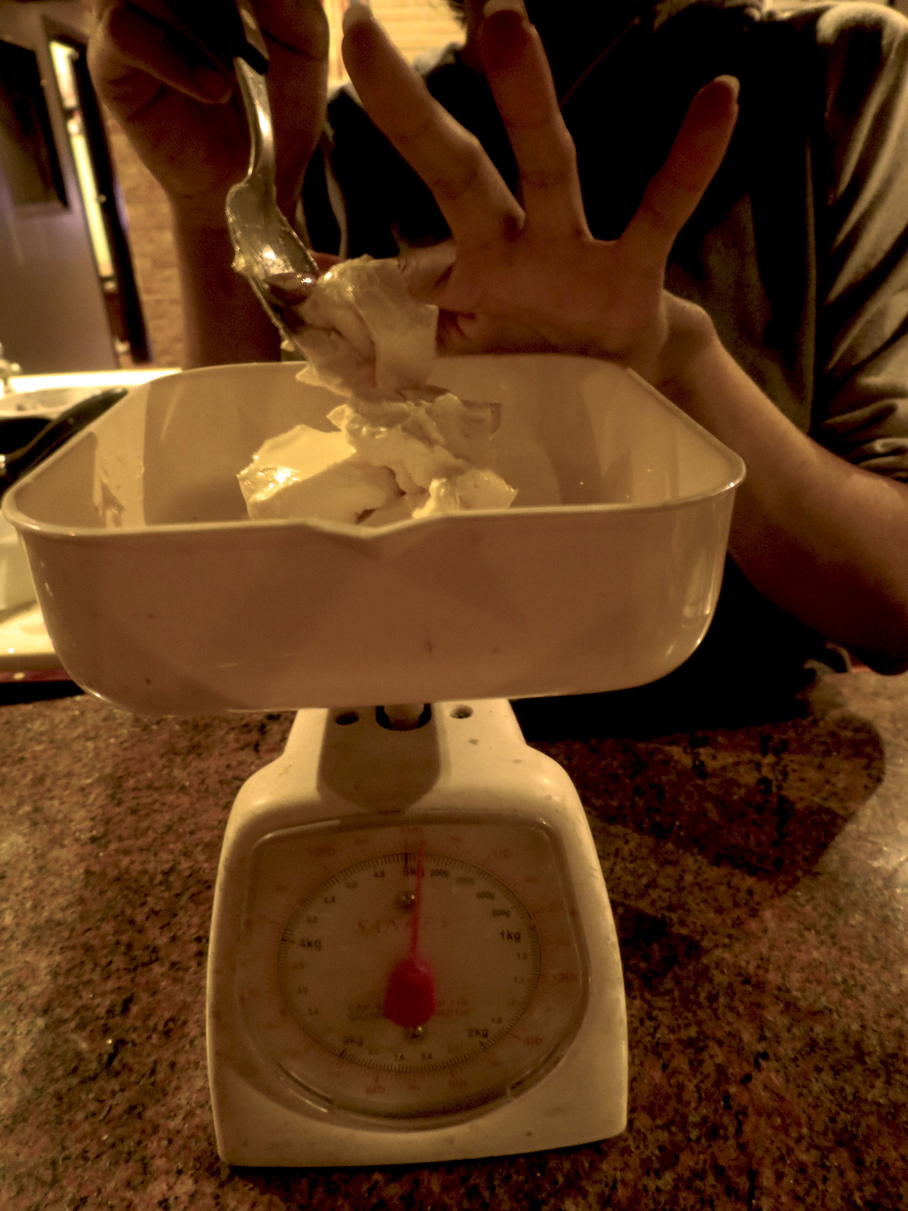 - Lo primero que debemos hacer es pesar los ingredientes que lo requieren. Con la margarina yo utilice un peso, para el azúcar y la harina utilice un vaso medidor ya que es más practico porque los numeros de las medidas se notan más.