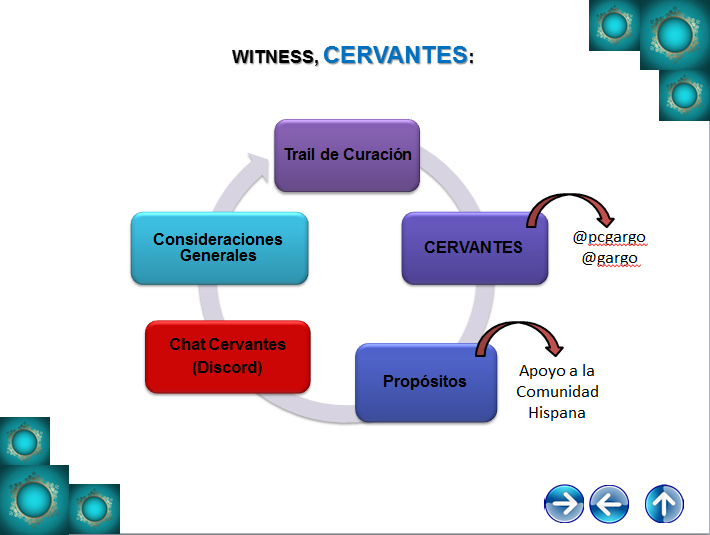 Aunado a todo lo anterior, hizo referencia directa a @cervantes como Witness en Steemit y sobre su labor como Curador o Curadores, centrados en el desarrollo y progreso de la comunidad hispana dentro de la red social en consideración, destacando de esa manera la ardua labor de @gargon y @pcgargo, como creadores, planificadores y promotores de todas las actividades pensadas desde el grupo cervantil, en beneficio de la comunidad hispano-parlante; así como también se habló del Chat Cervantes en Discord.