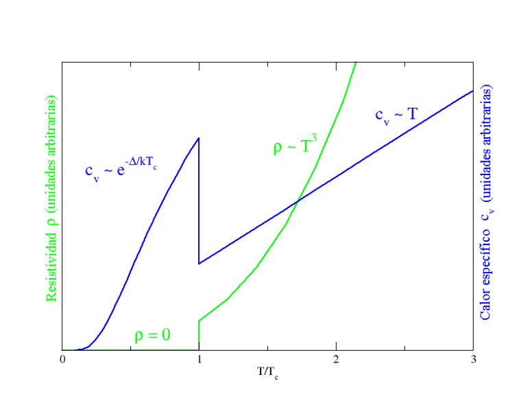 Resistividad y calor específico sin campo magnético para un superconductor típico, fuente de imagen de dominio de Wikimedia Commons,Author: Español: Traducción de Eynar a partir de la versión original en inglés de Alison Chaiken.