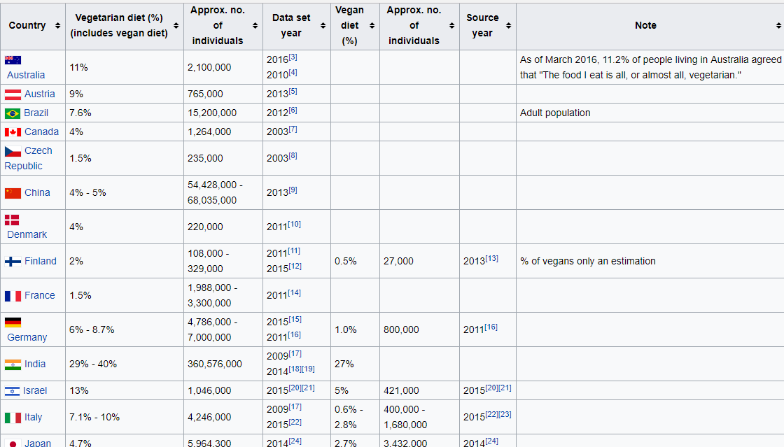 Estos datos los podemos son congruentes con las estadísticas de la gente que tiene una dieta vegana, la cual es más saludable. Es decir, en la siguiente tabla observamos el porcentaje de la población que es vegana en cada país, ordenado descendentemente, y como podríamos deducir, México no se encuentra ni siquiera en la tabla.