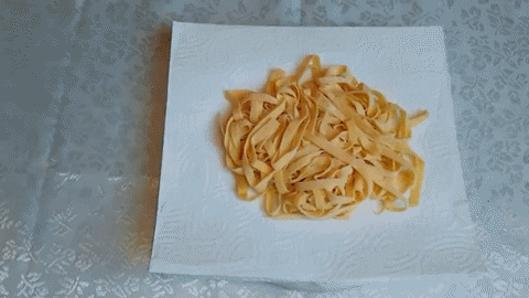 Elimina el exceso de harina y coloca tus fideos en una servilleta. Sepáralos en porciones de 125gr. / 150gr. Tu pasta fresca hecha en casa está lista!