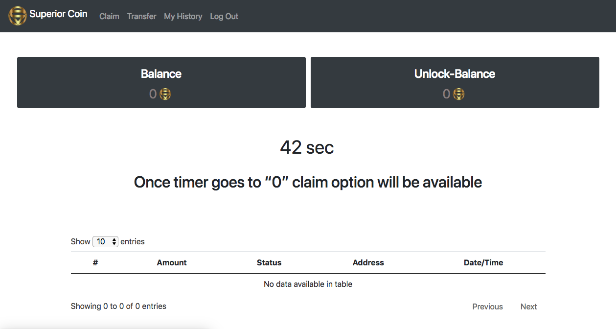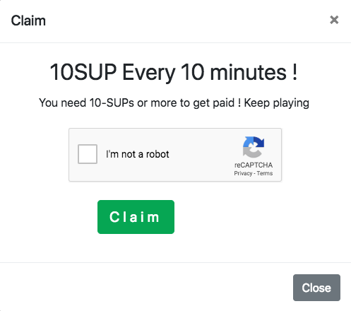 Esta sera nuestra pagina principal, si bien se puede notar existe un contador en 60 sec que reduce su tiempo a 0. Una vez este finalice nos habilitara una nueva ventana para poder reclamar nuestro primer SUP.