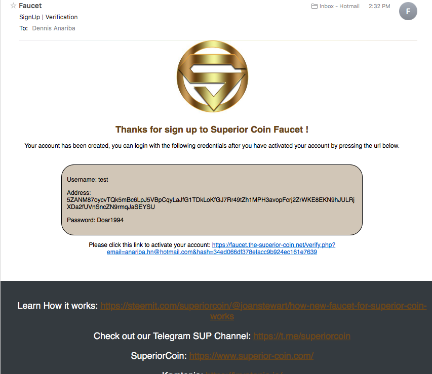 - El correo nos brindara la información con la que hemos creado nuestra cuenta y links referentes a los sitios mencionados en este articulo, de igual manera una guía en ingles de como funciona el faucet.