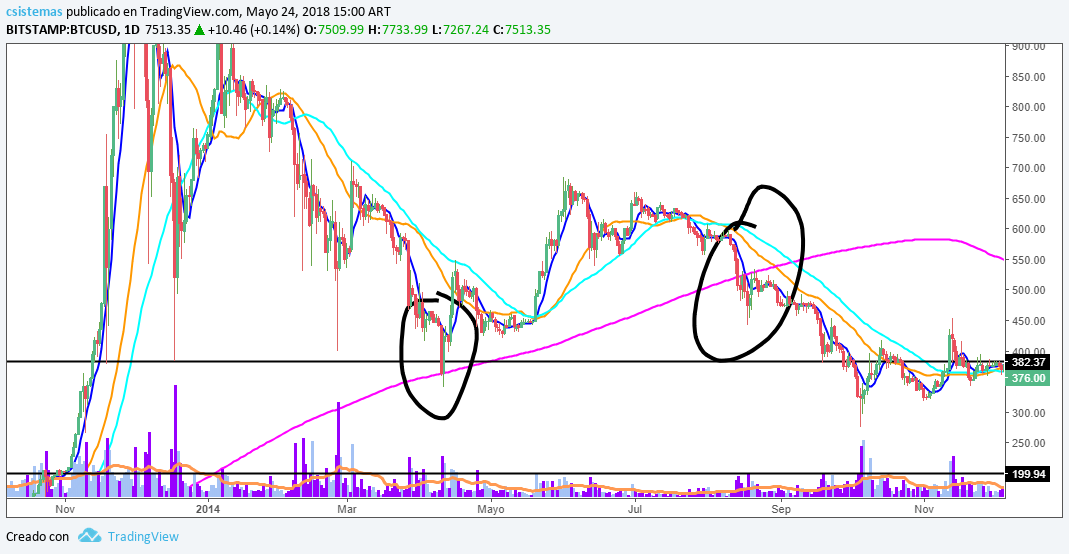 Ahora bien observando el gráfico vemos la linea de color rosa, es el 360 ma, promedio que sostuvo los precios durante la corrección del mes de marzo, asi que no descabellado pensar que el promedio vuelva a sostener el precio como ya lo hizo en la ultima oportunidad, pero ojo con esto por que a su vez ese promedio puede ser violado, el precio no se ha negociado por debajo de este promedio desde el año 2014 como se ve en esta grafica y para mi ese seria la señal de la entrada oficial al bear market.