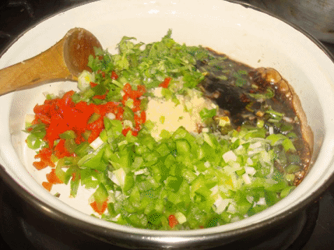3.Mientras se cocinan las lentejas, ponemos en el fuego un sartén con lo siguiente: El aceite, los dientes de ajo machacados, la cebolla, el pimentón, el ají dulce, cilantro, cebollín y la salsa de soya.