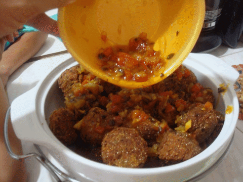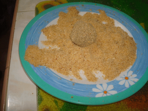 8.Preparamos las albóndigas con la ayuda de una cuchara y con nuestras manos le damos una forma redondeada, pasamos por el pan rallado y las freímos en un caldero con suficiente aceite bien caliente.
