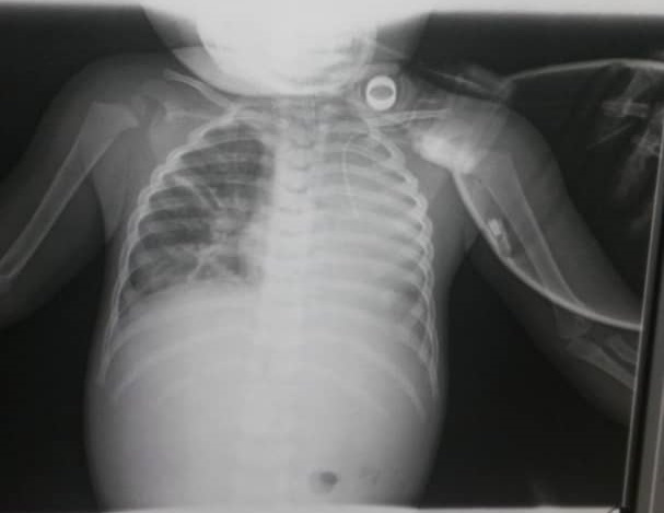 En esta imagen se visualiza una radiopacidad en campo pulmonar izquierdo, con un patrón lineal intersticial grosero derecho, lo anterior correspondiente con una atelectasia masiva izquierda y toque del intersticio pulmonar derecho (tejido de sostén del pulmón).