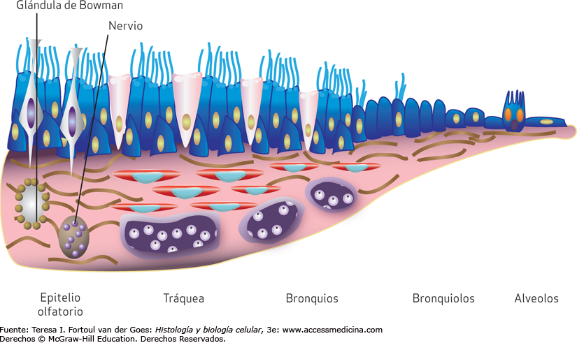 En la imagen anterior se aprecian una especie de palitos en color azul que sobresalen en la parte mas superior, esas protuberancias se denominan cilios y son los encargados de expulsar cuerpos extraños.