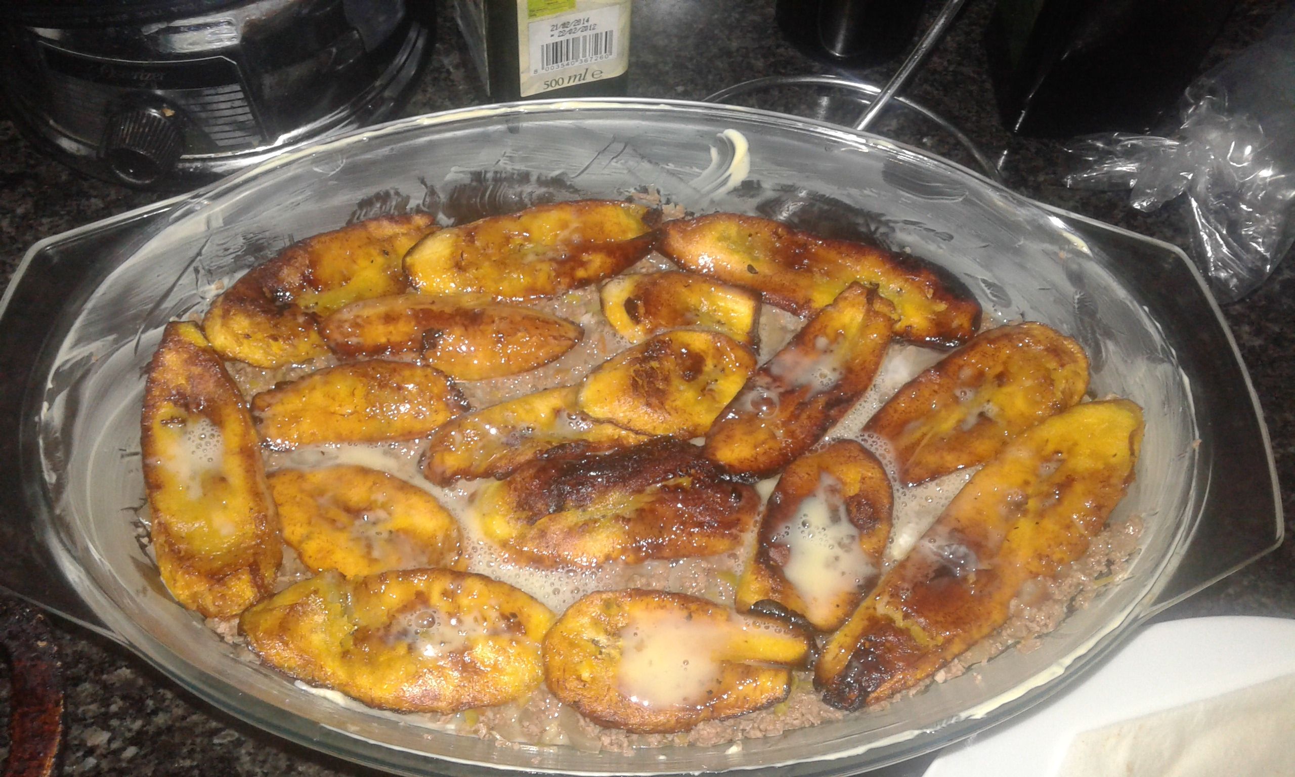 Primero una capa de platanos, segundo queso mozzarela, tercero un buen toque de carne molida y repetimos...