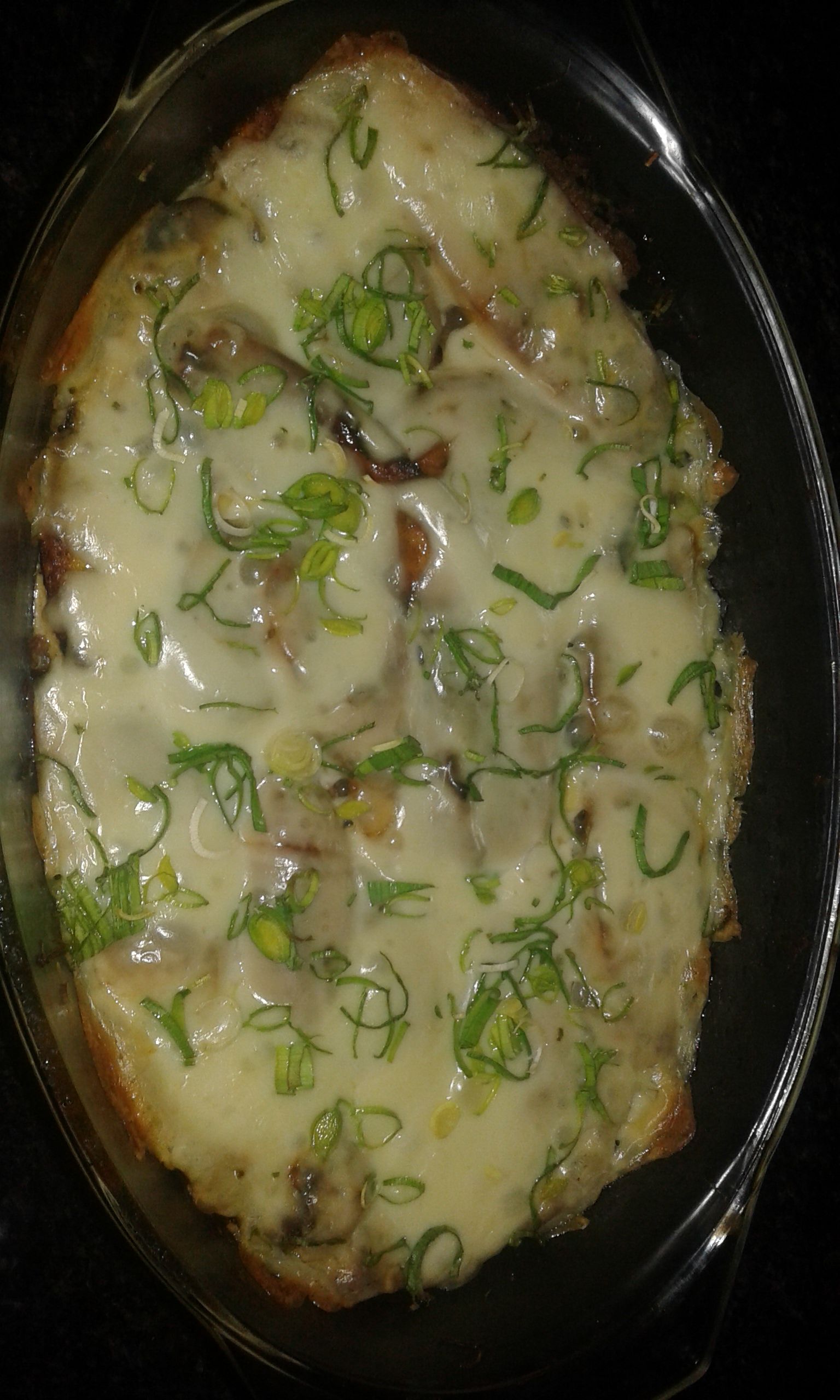 Despues de echar los huevos batidos encima, ponemos otra capa del delicioso queso mozzarella... un toquito de cebollin picado chiquitico para darle un semi toque de sabor al queso, y para adornar como tal!