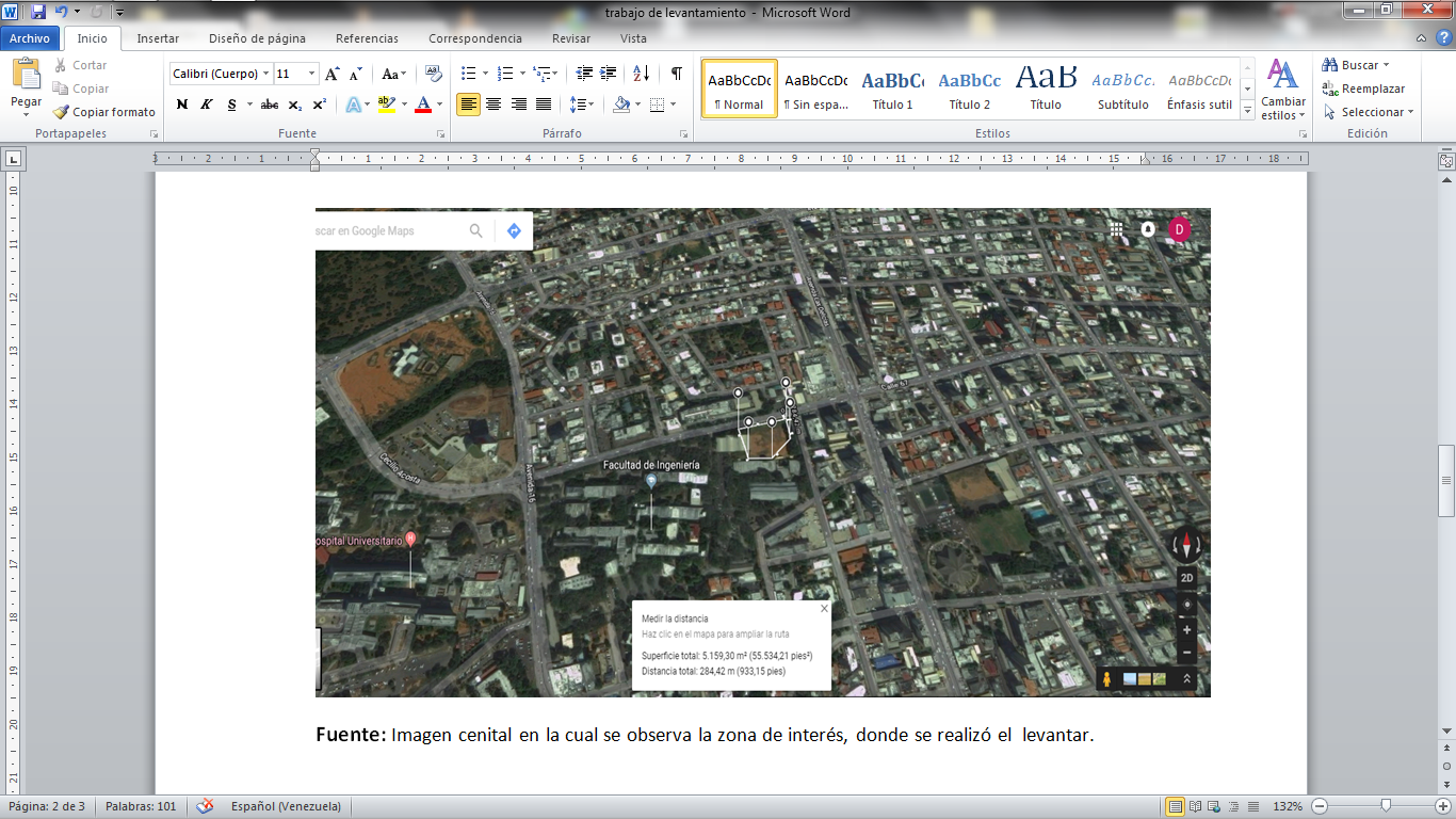Se establece mediante herramientas cartografiacas, sotware , mapas , conocer el area de interes en funcion al proyecto. ejemplo se realizo un levantamiento planialtietrico en la facultad de Ingenieria , tomando como referencia imagenes de google maps.
