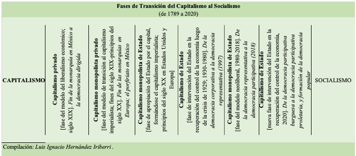 La transición del capitalismo al socialismo, es pues, la transición de la sociedad en donde los medios que producen para la sociedad (la tierra, las industrias, los huertos, las granjas, la ganadería extensiva, etc); y la producción social misma que no pertenecen a aquel mismo que los trabaja y produce, pasan del capitalista que se ha apropiado todo ello, al Estado en tanto administración de los reales intereses generales de la sociedad. Hay en ello, en consecuencia, tanto una transición de las formas económicas de una producción de mercancías y comercio de mercado (fases de modelos económicos capitalistas), a una producción de bienes de uso en un comercio de intercambio planificado; como una transición de las formas políticas de organización social, monárquica, dictatorial, o democrática (fases de evolución republicana –de res, cosa, asunto; y publis, pueblo– o de los asuntos del pueblo), a cada vez una mayor y real democracia.