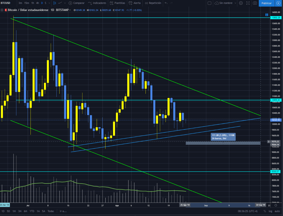 La tendencia alcista de Bitcoin se detuvo al llegar a $13800 para luego desarrollar un rango amplio de negociación en la cual ya lleva dos meses de subidas y bajadas. Lo último que se ha ido notando es una reducción progresiva del rango y del volumen. El vértice está a 26 días de distancia en tiempo y a medida que el rango se comprime más probabilidades hay de romperlo. Obsérvalo, compañero.