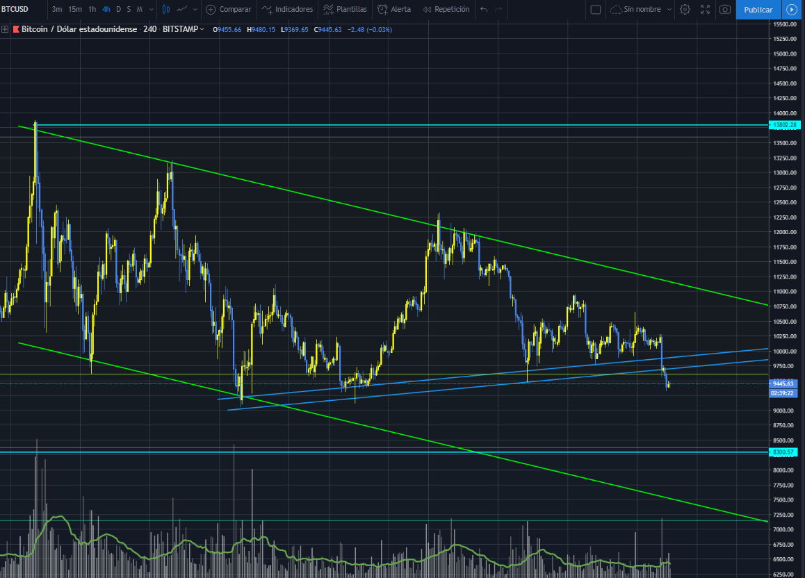$9200 parece ser el próximo nivel más lógico en esta bajada donde veremos la formación del siguiente patrón que probablemente sea de continuación bajista. La zona más importante de soporte que observo hasta ahora es la de $8300 la cual considero clave. La dejo dibujada en turquesa, compañero.