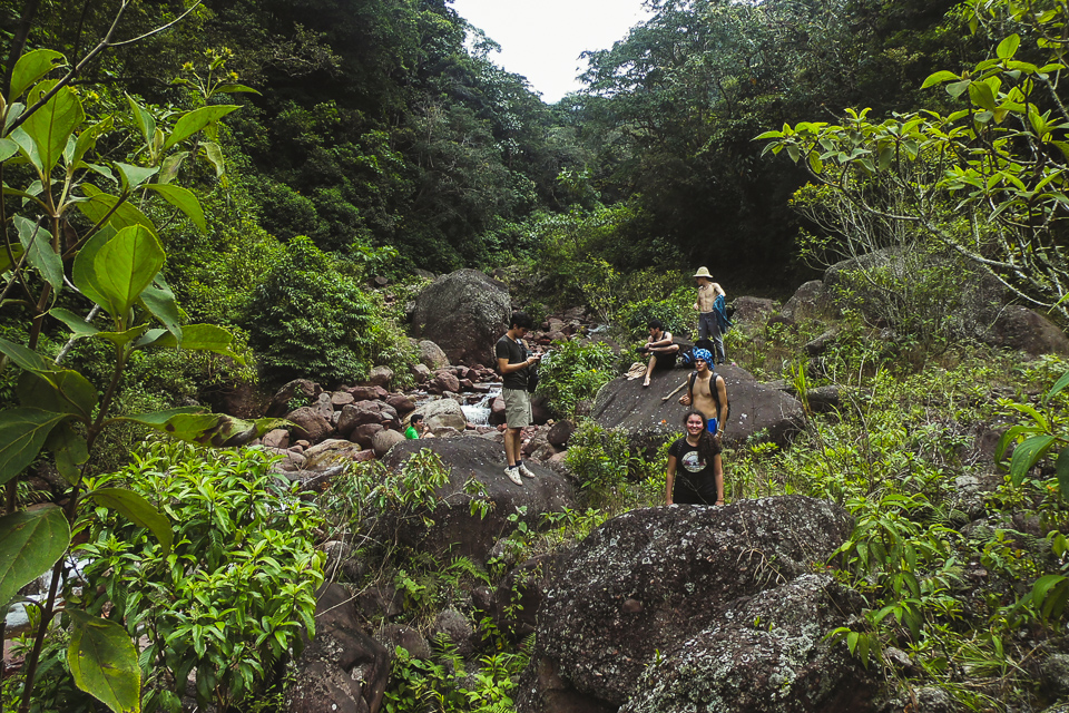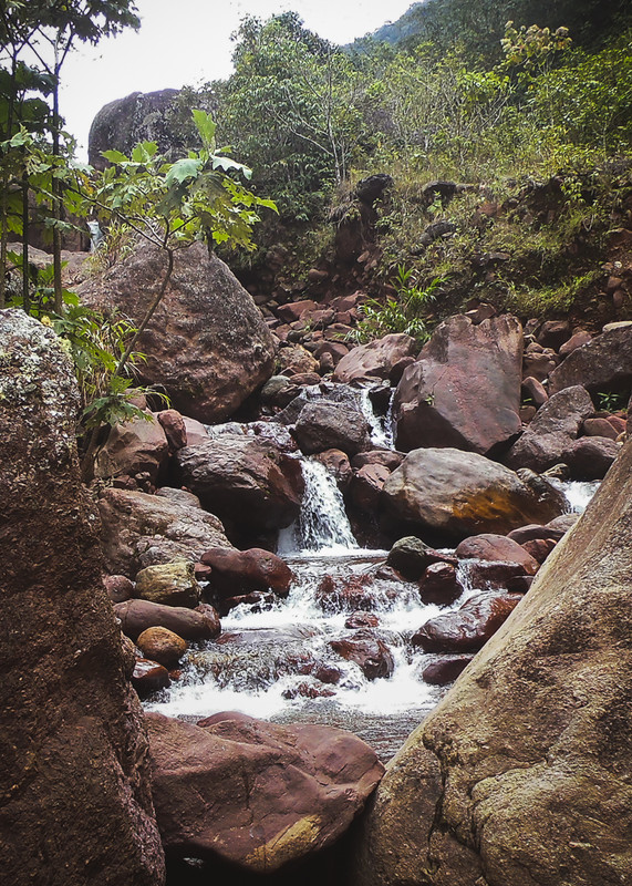 Después de la caída de Paola continuamos el camino un poco mas precavidos, tal vez. Seguimos el curso de agua, saltando sobre las rocas de la quebrada hasta acercarnos a la base de la cascada que se alzaba a mas de media montaña arriba por un tramo muy vertical y muy resbaladizo. Evaluamos la situación y decidimos que habían sido ya muchas aventuras por un día, la cuesta se veía muy empinada y traicionera para escalar. Al final, nunca logramos llegar a la cascada, solo verla desde el pie de monte junto a la quebrada.