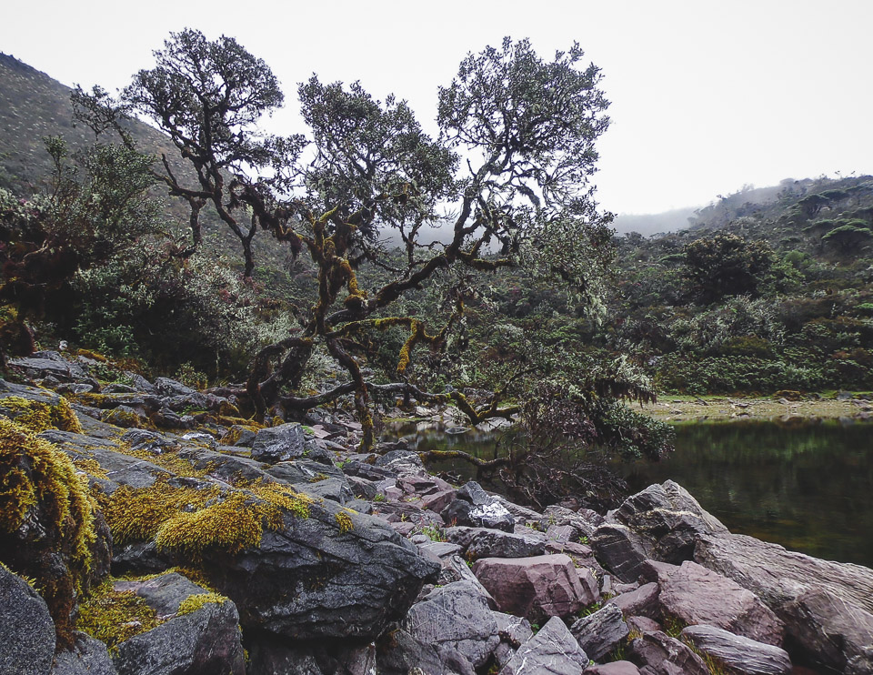 Caminamos alrededor de la laguna hasta encontrar un buen lugar para montar el campamento, justo cuando terminamos y después de comer, comenzó a llover muchísimo. Todos nos resguardamos en las carpas mientas nos preparábamos para las frías temperaturas que pueden descender hasta menos de 0°C en las noches. Llovió toda la tarde hasta un poco antes del anochecer, cuando cesó la lluvia salí a tomar algunas fotos: Esta imagen es mi favorita de todo el viaje. El frio y la montaña son protagonistas en esta escena.