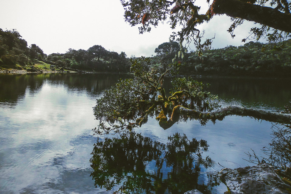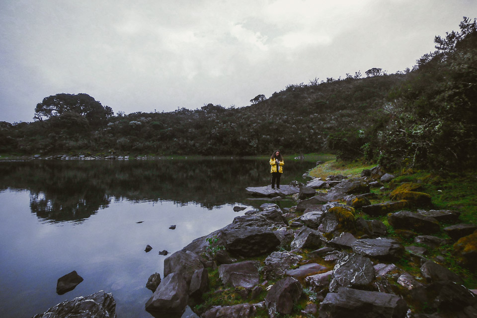 El camino continúa montaña arriba hasta encontrarse con una fila de arboles barbudos, de colores llamativos, llenos de musgo y lama que marcan la entrada a la laguna. El recorrido en general es bastante sencillo, de unas pocas horas; inicia a un costado de los sembradíos de fresas y va tomando inclinación a medida que se recorre la montaña, es importante siempre estar pendiente del sendero para no perderse entre la neblina.
