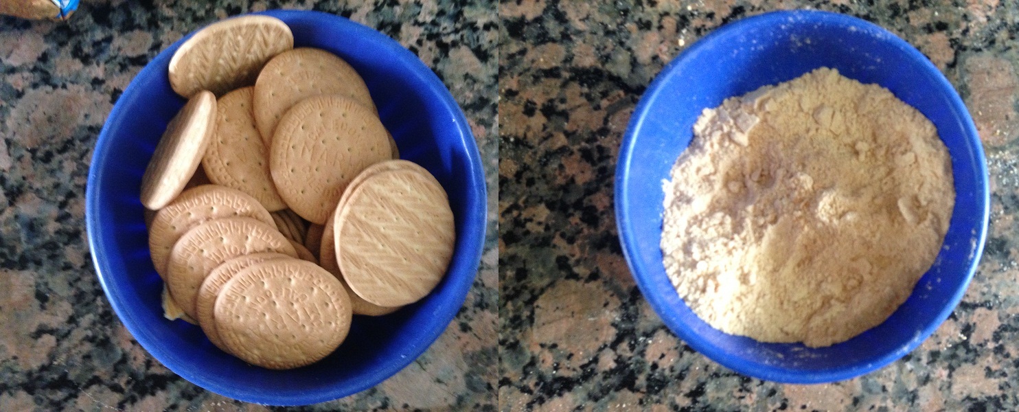 Para esta parte vamos a agarrar todas las galletas y las trituraremos hasta que estén echas polvo luego las mezclaremos con la mantequilla y lo esparcimos de manera uniforme en nuestra bandeja para luego meter en el refrigerador a reposar mientras hacemos la mezcla, recuerden que mientras mas tiempo pase en el refrigerador mejor se cocinara y mas crujiente estará.