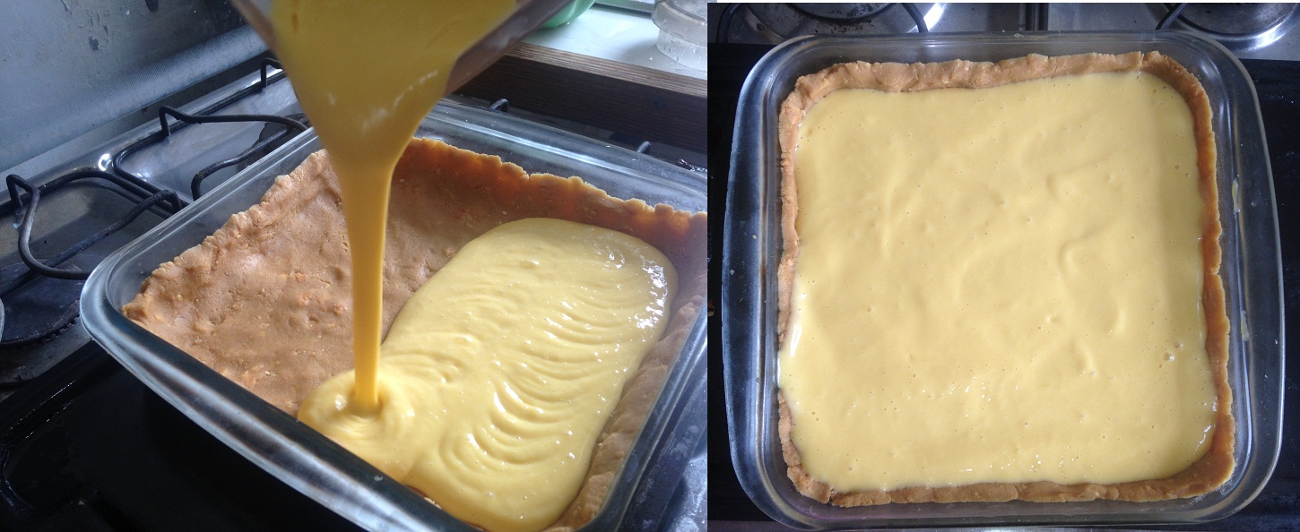Ya teniendo las 3 partes listas procedemos a sacar la bandeja con la base del refrigerador, vertimos la mezcla que teníamos reposando.