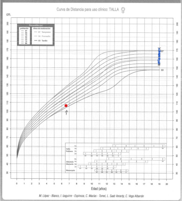 Esta es la Curva de Crecimiento de Fundacredesa para niñas venezolanas, se muestra con el punto rojo como se ubica la estatura de la paciente en el p3, y con los trazos azules se grafica el rango del potencial genético familiar.