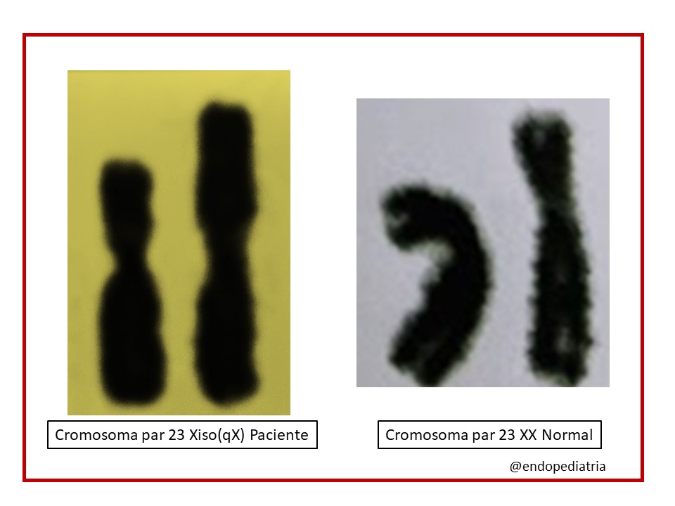 Un isocromosoma es un cromosoma estructuralmente anormal compuesto por 2 brazos cortos o 2 brazos largos, ocurre por una inadecuada división transversa del centrómero lo que conduce a una constitución croomosómica desbalanceada, con monosomía de los brazos perdidos y trisomía de los brazos duplicados. En nuestra paciente el cromosoma afectado es el sexual (par 23), tiene un cromosoma X normal, y el otro con 2 brazos largos, se pedió un brazo corto, este cariotipo constituye una de las posibles alteraciones cromosómicas encontradas en el Síndrome de Turner.