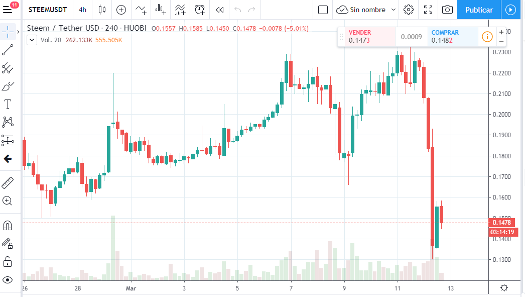 El steem cayó a 0.14 aproximadamente, quizás en un futuro pueda recuperarse ya que es una gran oportunidad para ballenas comprar Steem y tener más influencia en la red.