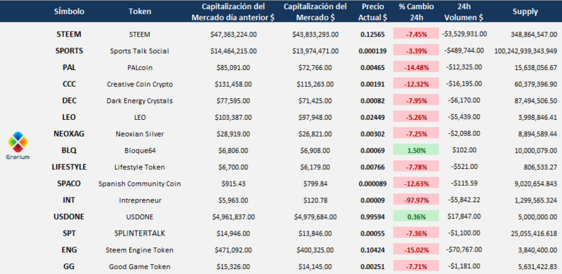 El proyecto Erarium ha venido trayéndoles información referente al trading, las finanzas, la economía, el ahorro y análisis técnicos de las principales criptomonedas entre muchas otras cosas relacionadas con el mundo financiero. Sin embargo, @erarium ancla sus actividades principales de inversión y formación con la comunidad de Steem, y es por esto que hemos decidido darles información referente al mercado de SteemEngine y mostrarles un seguimiento exhaustivo de los que consideramos los principales tokens de dicho mercado, y su variación cada 24 horas, todo esto con el fin de que puedan tener una visión general de cómo se comporta éste, y además tengan una idea de cuando es propicio comprar o vender ciertos tokens para preservar nuestro capital.