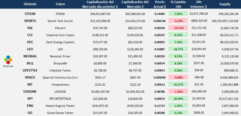 El proyecto Erarium ha venido trayéndoles información referente al trading, las finanzas, la economía, el ahorro y análisis técnicos de las principales criptomonedas entre muchas otras cosas relacionadas con el mundo financiero. Sin embargo, @erarium ancla sus actividades principales de inversión y formación con la comunidad de Steem, y es por esto que hemos decidido darles información referente al mercado de SteemEngine y mostrarles un seguimiento exhaustivo de los que consideramos los principales tokens de dicho mercado, y su variación cada 24 horas, todo esto con el fin de que puedan tener una visión general de cómo se comporta éste, y además tengan una idea de cuando es propicio comprar o vender ciertos tokens para preservar nuestro capital.
