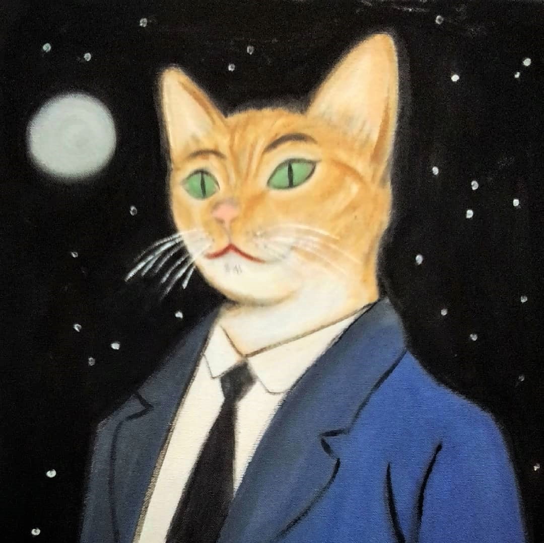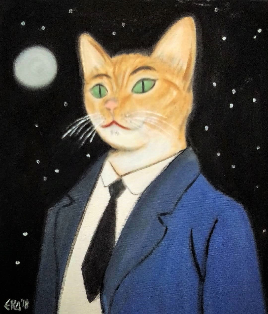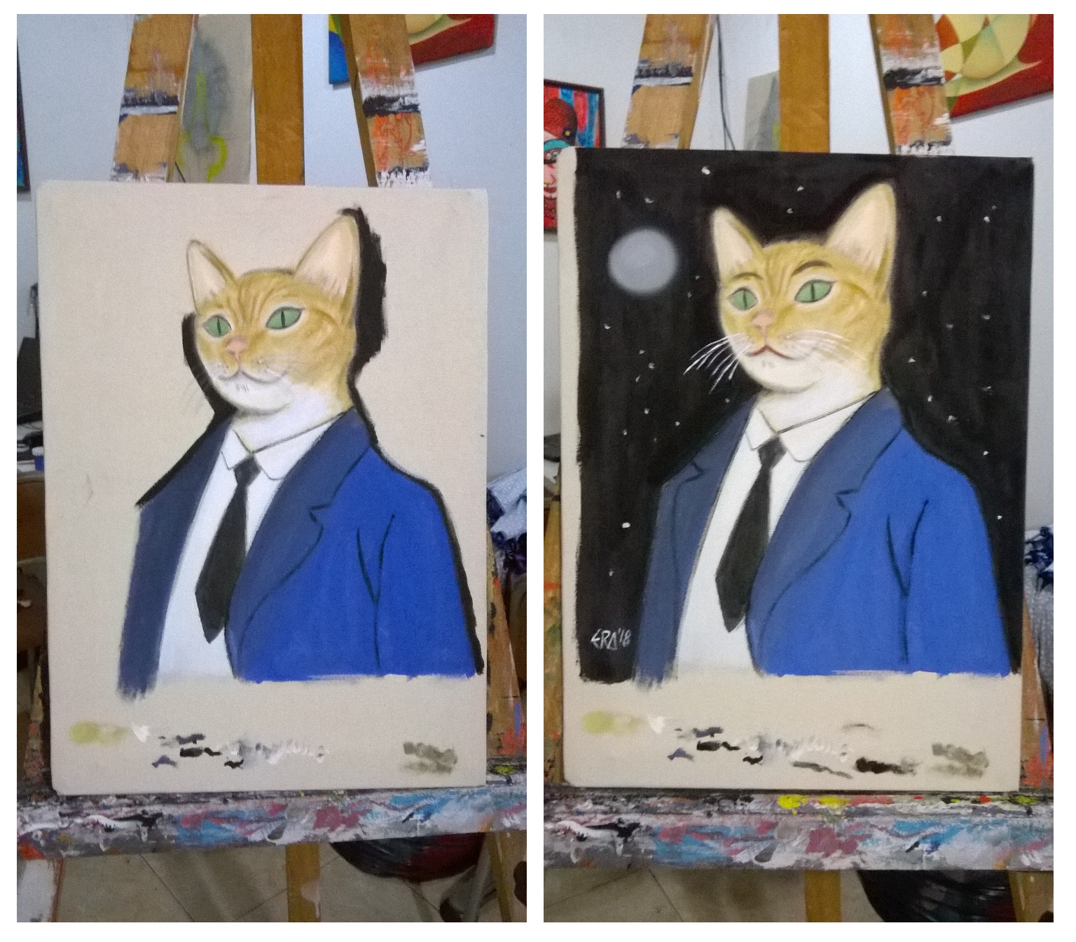 En esta nueva ocasión, quise retratar a un lindo gato, uno con cejas y cuerpo de humano. Bajo una noche llena de estrellas y una luna llena. ¿Raro? Sí, y bastante.