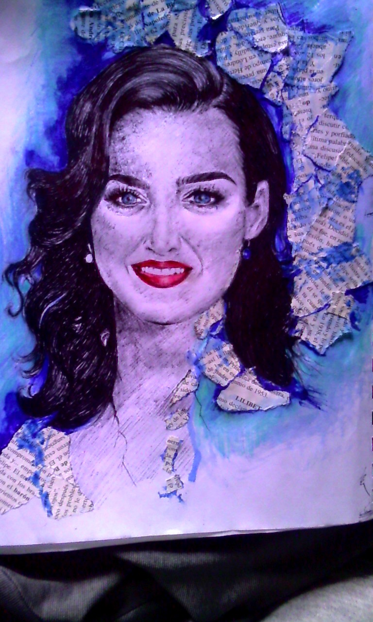 Al momento de concluir toda el área de rostro y el cabello comencé a incorporar los fragmentos de revista( ya saben cuanto me gusta hacer Collage), sobre eso trabajé las manchas con acuarelas y marcadores; teniendo en cuenta que para el rostro opté por mezclar el bolígrafo azul con la tinta del bolígrafo negro y para los labios el rojo.