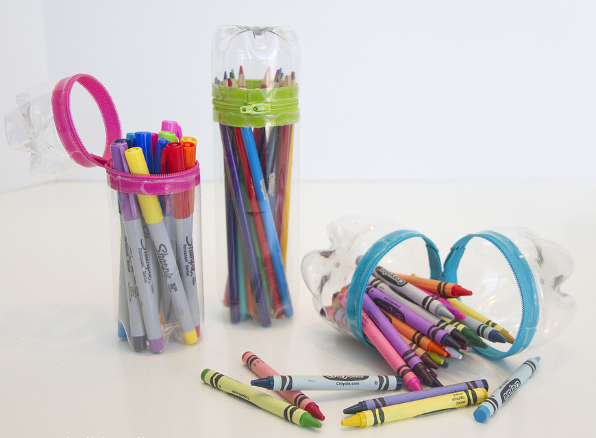 Desde monederos, hasta estuches para los crayones y marcadores. Son sencillos de hacer, solo necesitas botellas, cierres, y pegamento para fijarlos. Son muy prácticos.