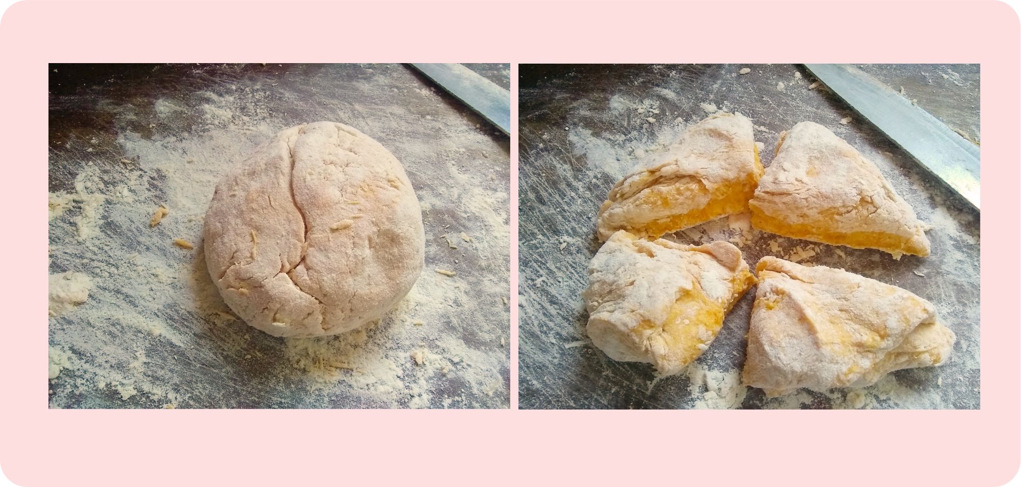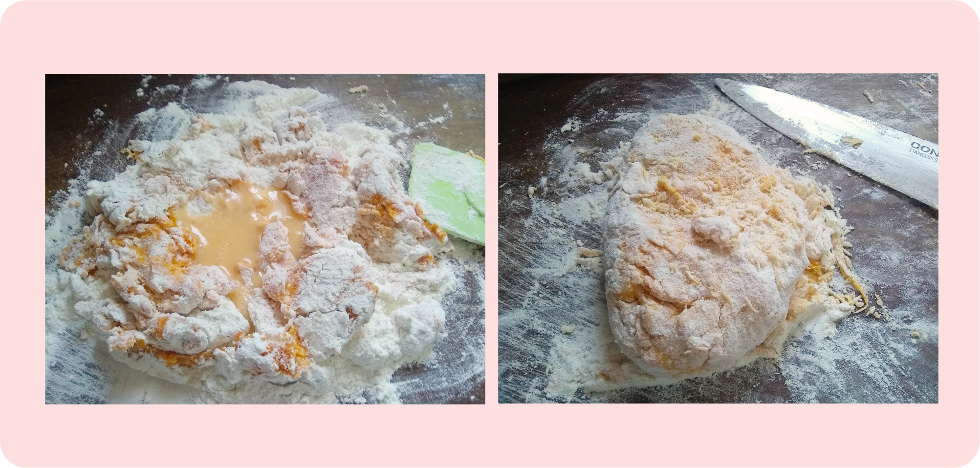 Uso un cuchillo para retirar los restos de la masa que se pegan a la tabla y los incorporo a la masa.