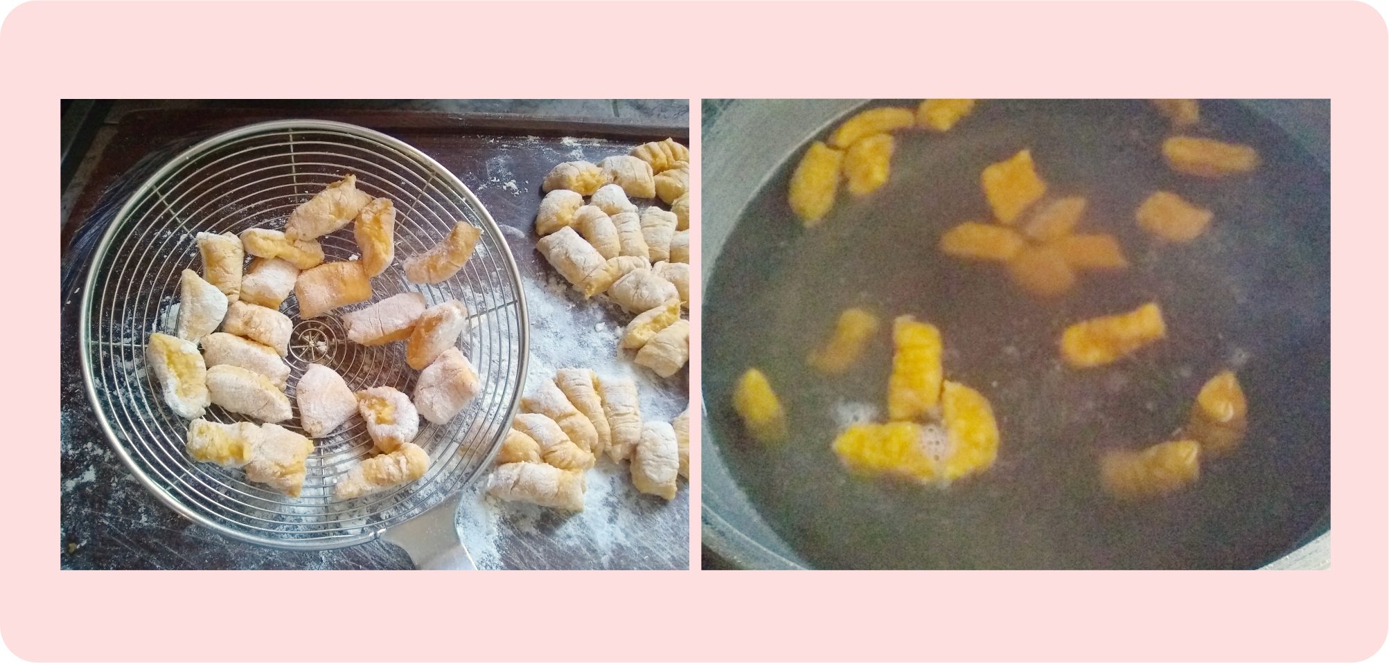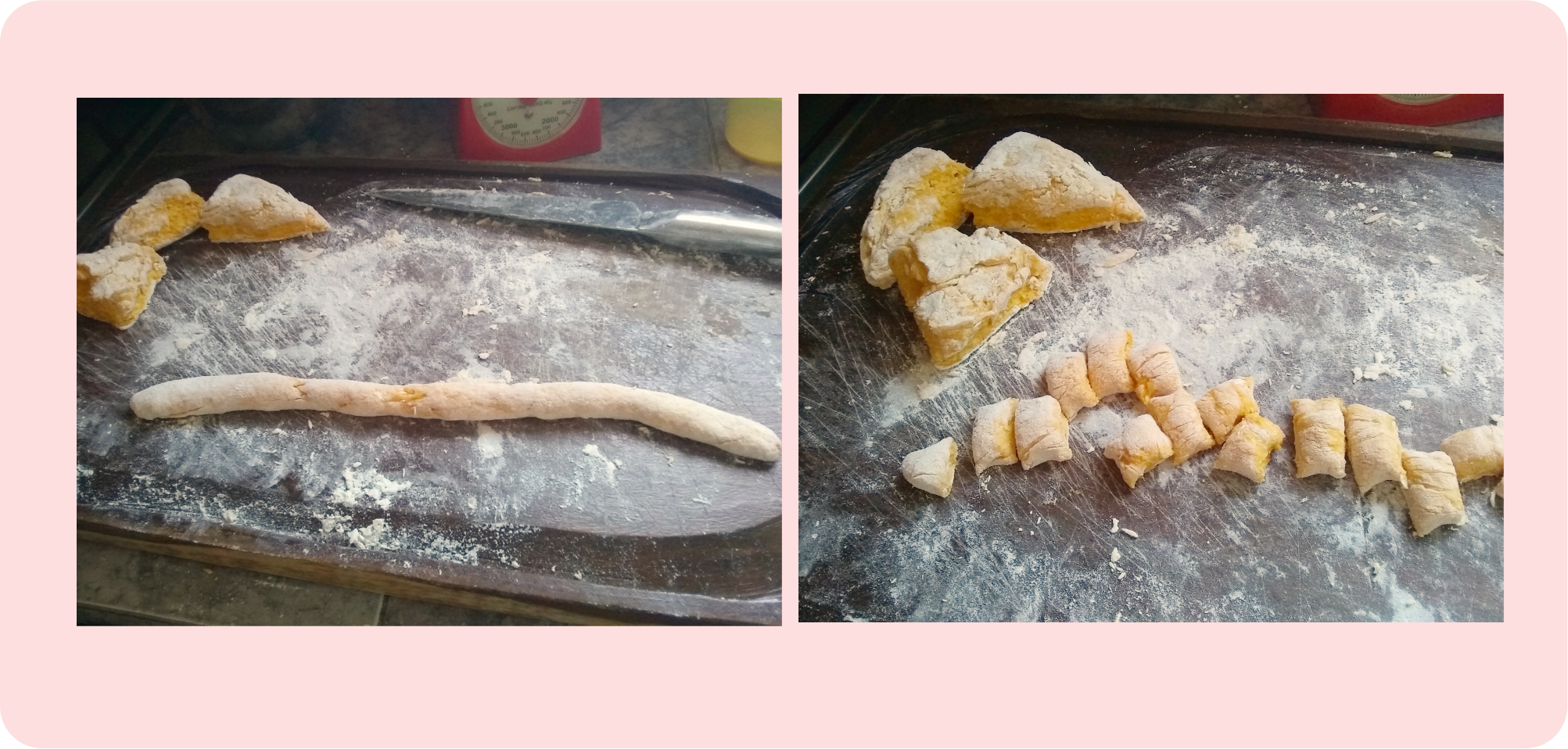 Nota: Mis ñoquis no tienen la tipica forma con canales, para esto venden una tabla especial o también algunas personas le dan forma con un tenedor.