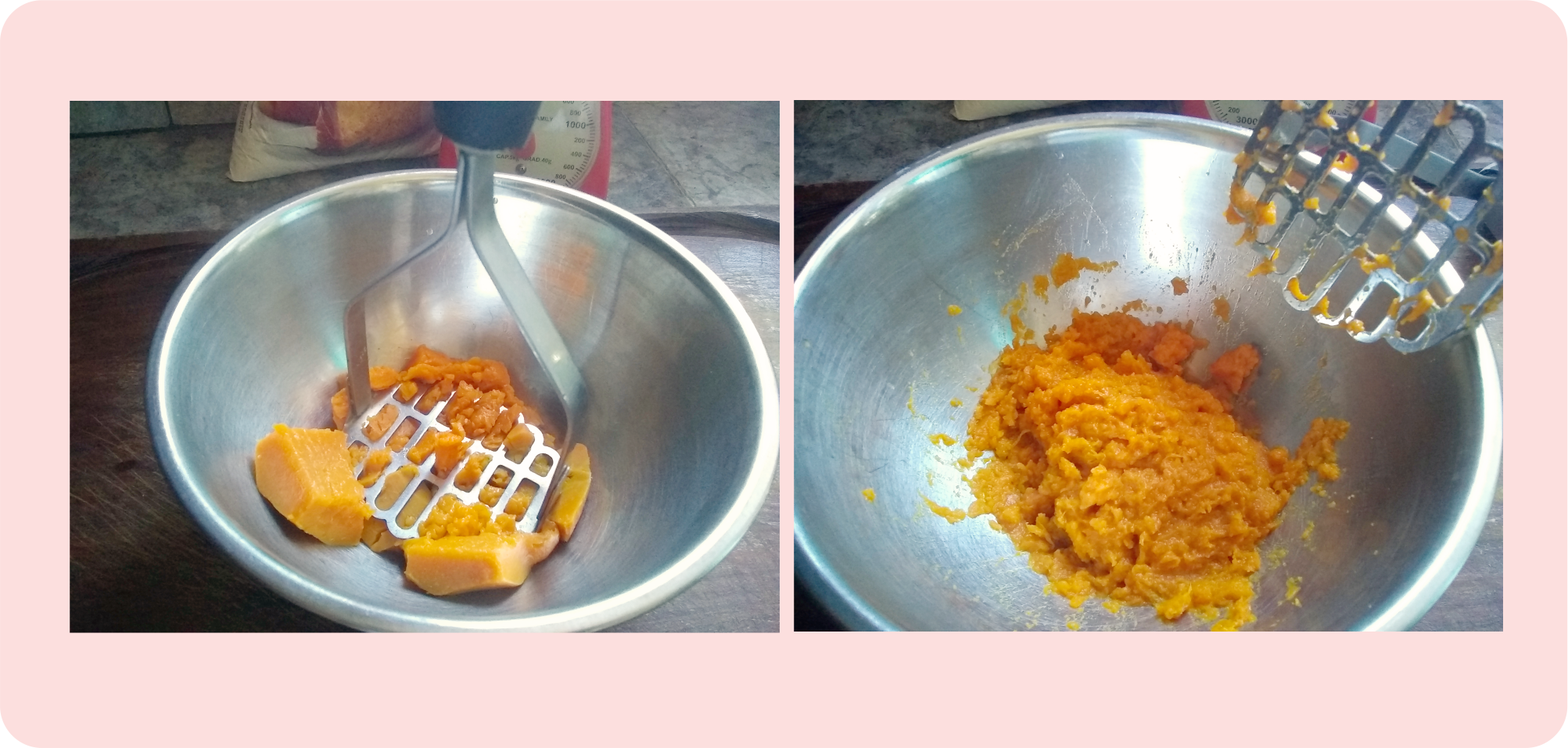 - Agregar 100 gramos de harina al puré de ayumana (calabaza).Al principio prefiero usar una espátula para unir estos ingredientes.