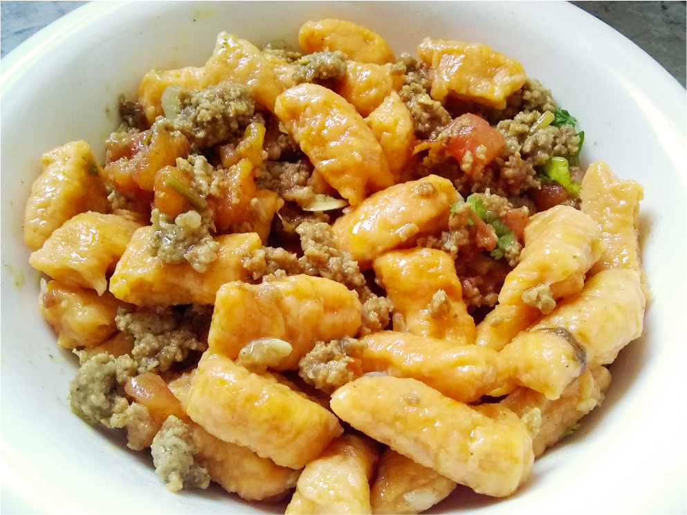 ¡Los ñoquis son deliciosos con cualquier tipo de salsa sea blanca, bologna o de vegetales! Yo los acompañé con una salteado de carne molida de res y vegetales.